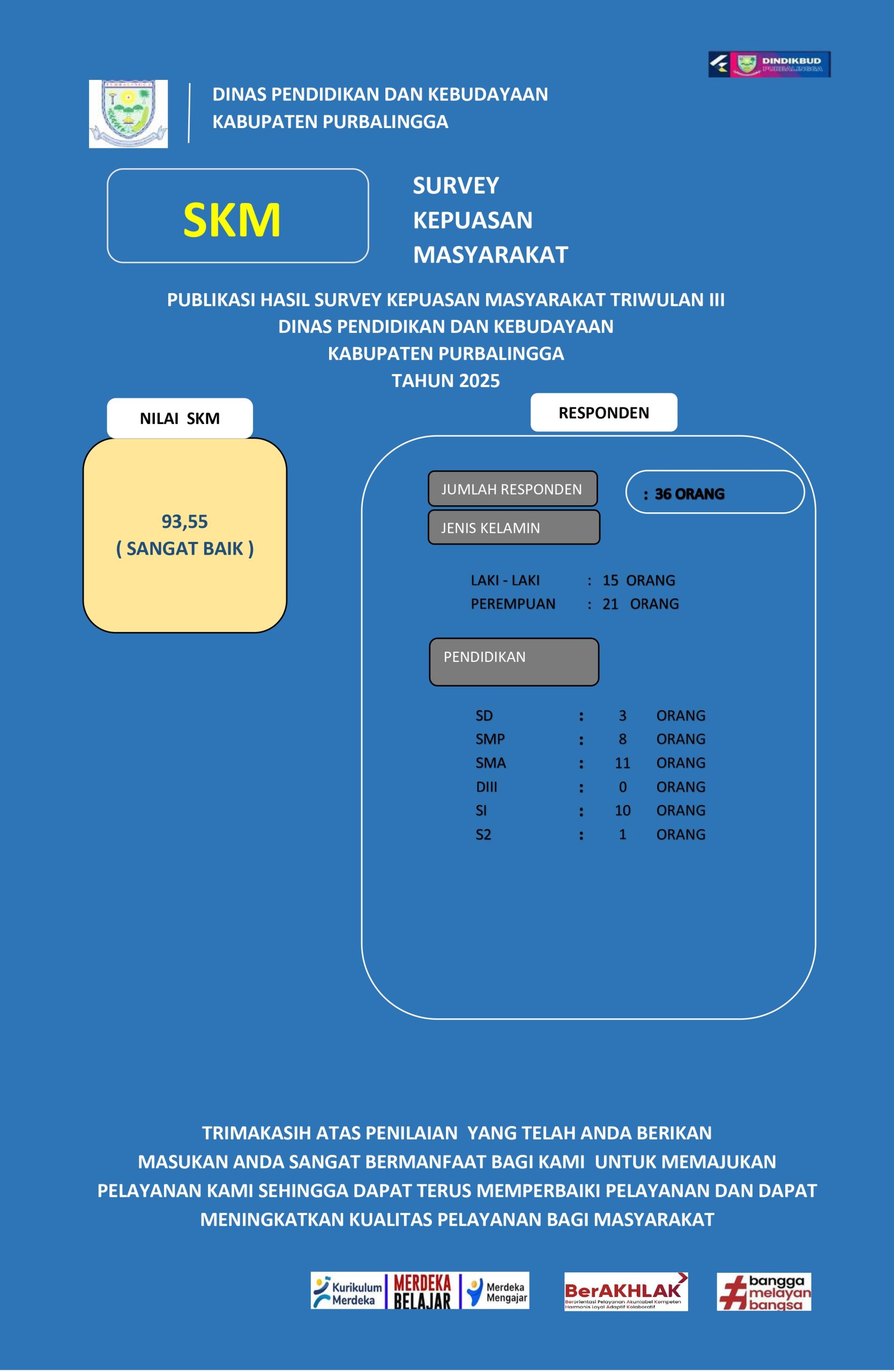 Berikut kami sampaikan hasil Survey Kepuasan Masyarakat terhadap pelayanan di Dinas Pendidikan dan Kebudayaan Kabupaten Purbalingga Tribulan III Tahun 2025. Kami ucapkan terima kasih atas masukan dan kepercayaan masyarakat. Hasil ini akan menjadi dasar bagi kami dalam meningkatkan kualitas pelayanan di Dinas Pendidikan dan Kebudayaan Kabupaten Purbalingga.