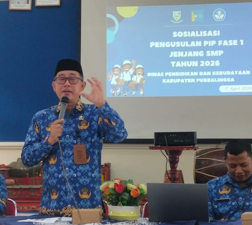 PURBALINGGA_DINDIKBUD_ Dinas Pendidikan dan Kebudayaan Kabupaten Purbalingga menggelar Sosialisasi Usulan Program Indonesia Pintar (PIP) Fase 1 jenjang SMP Tahun 2026 guna memastikan penyaluran bantuan pendidikan berjalan tepat sasaran dan akuntabel. Kegiatan ini berlangsung pada Jumat (17/04/2026) di Aula Sudirman dan diikuti oleh para kepala SMP serta operator sekolah se-Kabupaten Purbalingga.