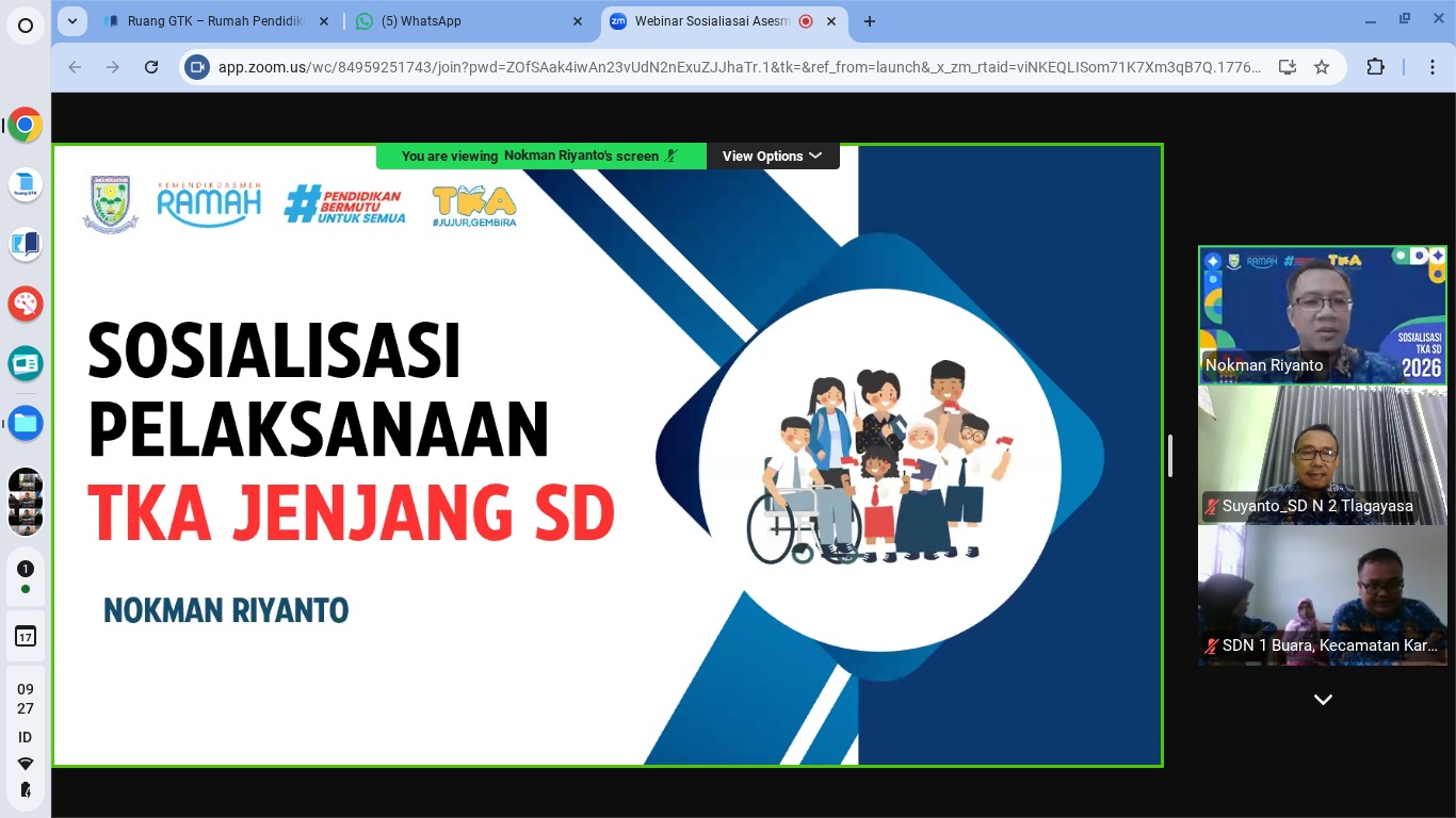 PURBALINGGA_DINDIKBUD_ Dinas Pendidikan dan Kebudayaan Kabupaten Purbalingga menyelenggarakan Webinar Sosialisasi Pelaksanaan dan Kepengawasan Tes Kemampuan Akademik (TKA) jenjang Sekolah Dasar (SD) secara daring pada Kamis (17/04/2026). Kegiatan ini diikuti oleh sekitar 650 peserta yang terdiri dari kepala sekolah, proktor, teknisi, serta pengawas TKA SD dari seluruh wilayah Kabupaten Purbalingga.